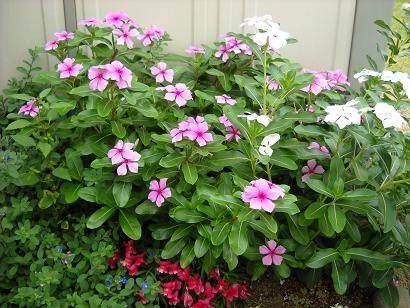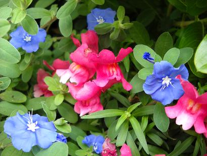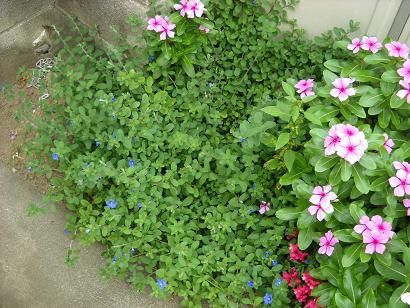 上から日々草 隣からブルーに押される金魚草